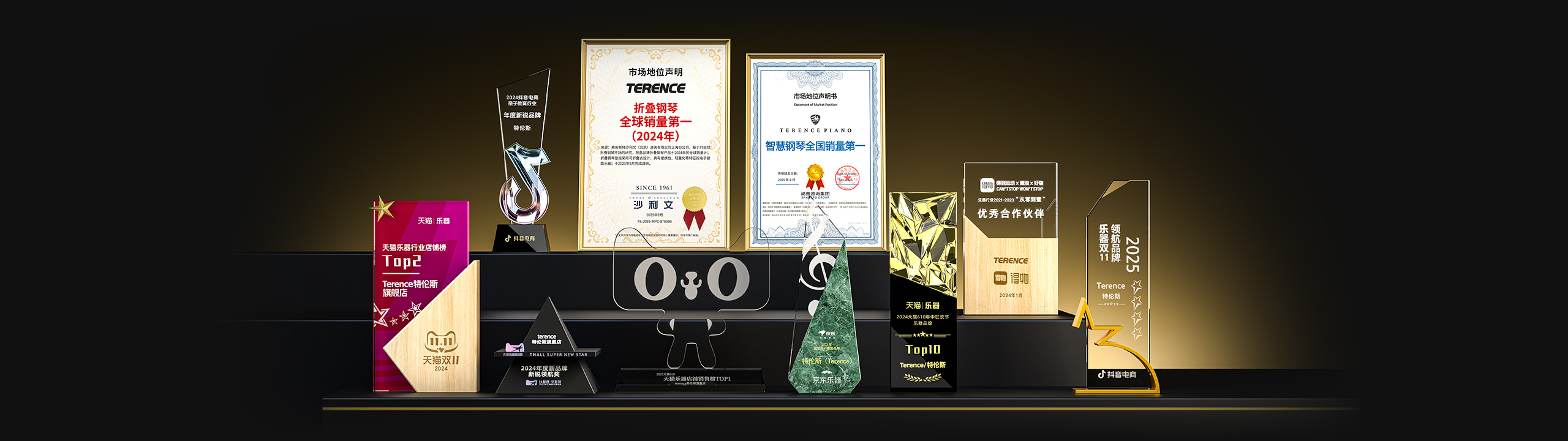 特倫斯創(chuàng)新科技榮獲:折疊鋼琴全球銷(xiāo)量第一(2024年)[1]、智慧鋼琴全國(guó)銷(xiāo)量第一[2]、2025年天貓618樂(lè)器設(shè)備店鋪榜TOP2、2025年天貓雙11樂(lè)器店鋪榜TOP1、2025年天貓雙11樂(lè)器品牌榜TOP3、2022年天貓樂(lè)器行業(yè)TOP1、2023年天貓618樂(lè)器行業(yè)TOP1、2024抖音電商年度新銳品牌、2024天貓樂(lè)器店鋪TOP2、2024天貓年度新品牌新銳領(lǐng)航獎(jiǎng)、2023年京東最受用戶喜愛(ài)品牌等獎(jiǎng)項(xiàng);